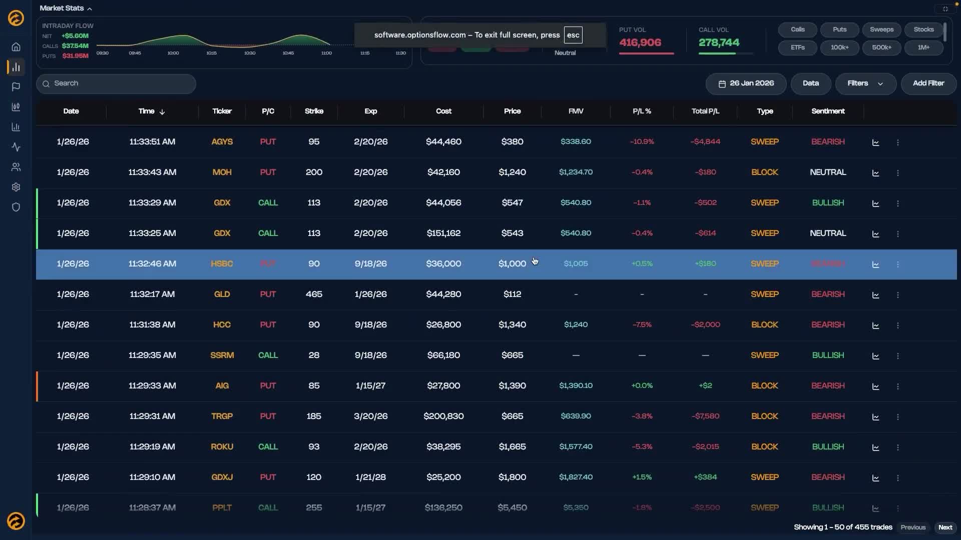 | Date | Time | Ticker | P/C | Spot | Strike | Exp | Cost | Price | FMV | P/L % | Total P/L | Type | Sentiment | |